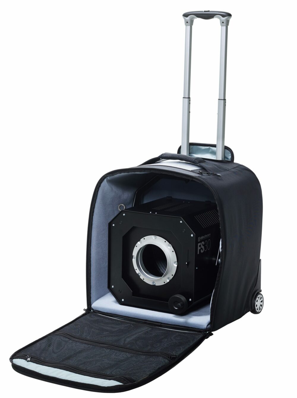 The Fresnel Spot is also delivered it in a smart rolling case case that is very handy when you want to take the FS30 on location or hire it out.