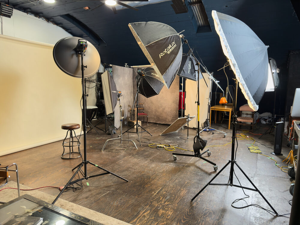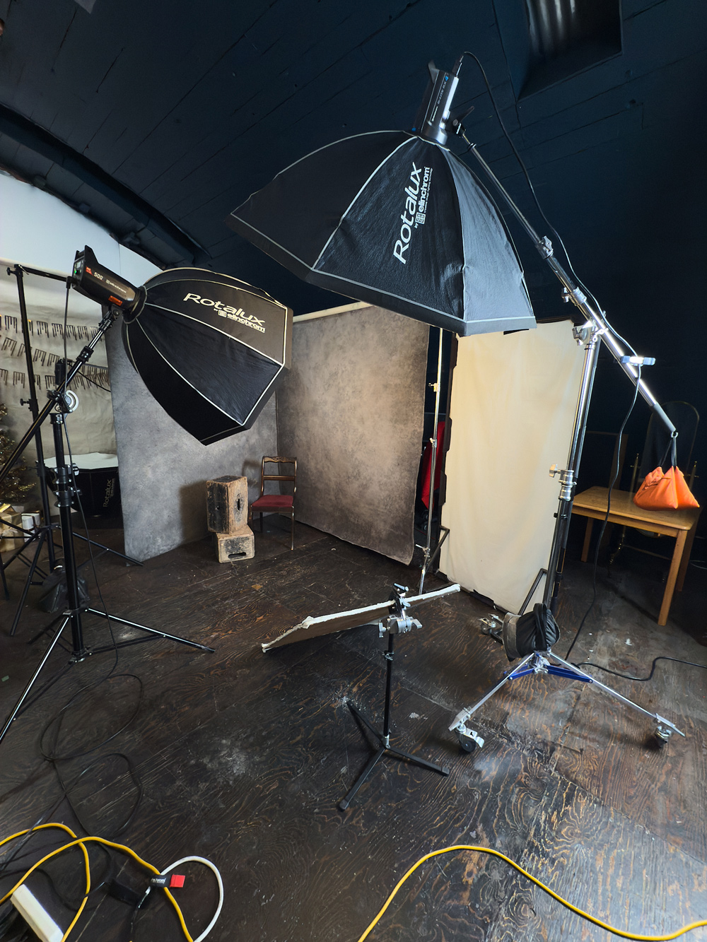 This setup featured two painted canvas backdrops arranged as a corner. The key light was an ELC Pro HD 500 fitted with a 39” Rotalux Deep Octa, complemented by a D-Lite RX4 boomed overhead with a 53” Rotalux Octa for fill. To further enhance the lighting, I added a large white fill board on the right side and a small white fill board below, clamped to a floor stand.