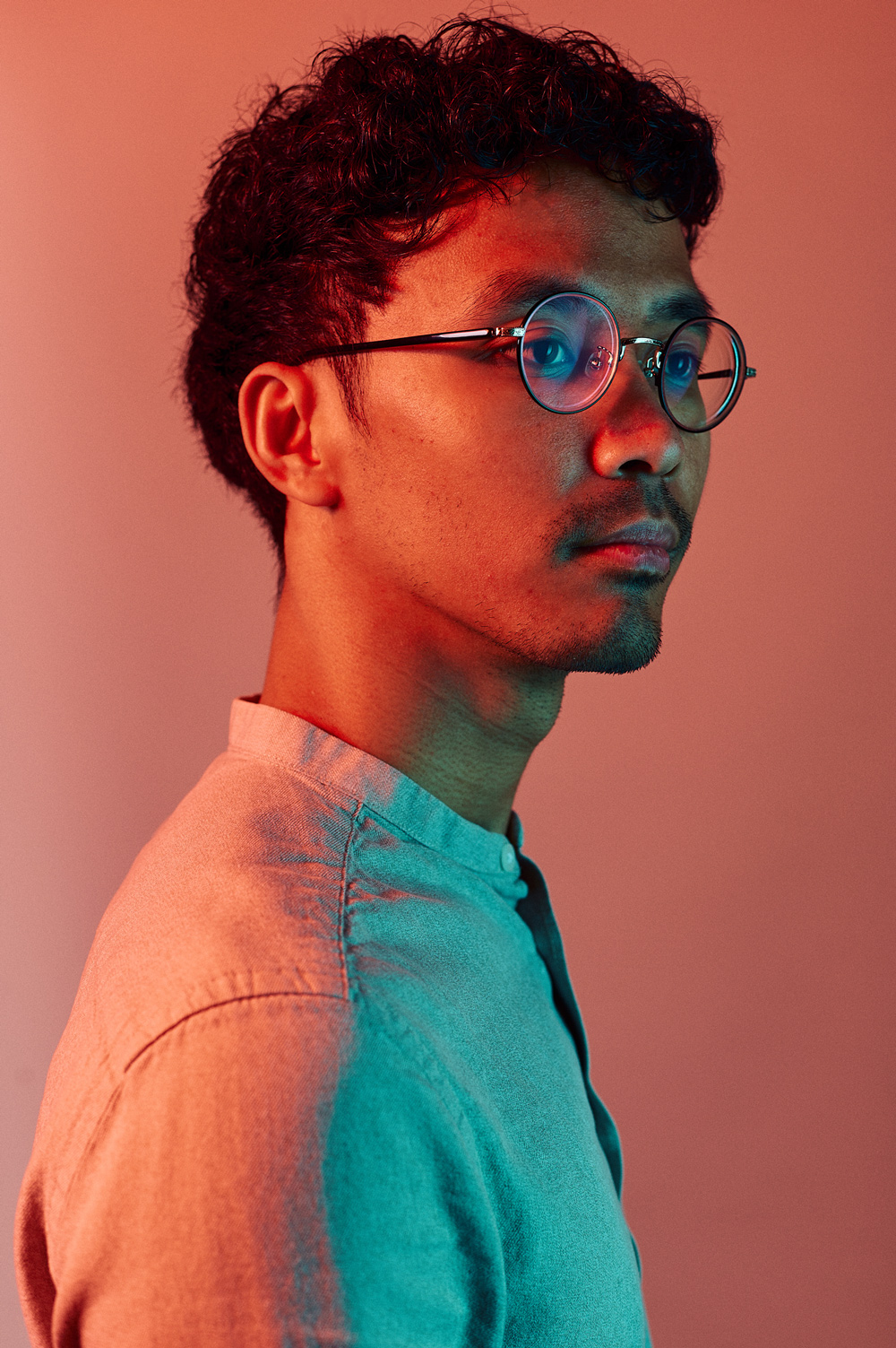This configuration utilized a cream-colored backdrop with bold, colorful lighting. A D-Lite RX4, modified with a 70cm white beauty dish and a red gel, served as the key light. A D-Lite RX ONE with a 35x100cm strip box and a cyan gel acted as the second light, creating a striking two-tone effect. To add even more dynamism, I experimented with slow shutter speeds to incorporate ambient LED lighting for an artistic, motion-blended effect.