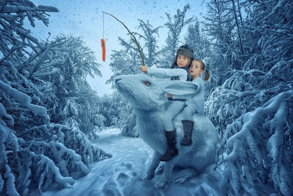 I guess an average image takes all in all (from idea until upload) 6 hours net. First you have to get the idea. Luckily this happens pretty spontaneously in my case. But I always write it down first and let it grow a little in the depth of my mind. Then (mostly on Fridays) I take the actors and elements I need to my little attic photo studio (or on location). Shooting with kids must not take too long because they cannot concentrate for a long time. After the shooting I put the single elements together in Photoshop.