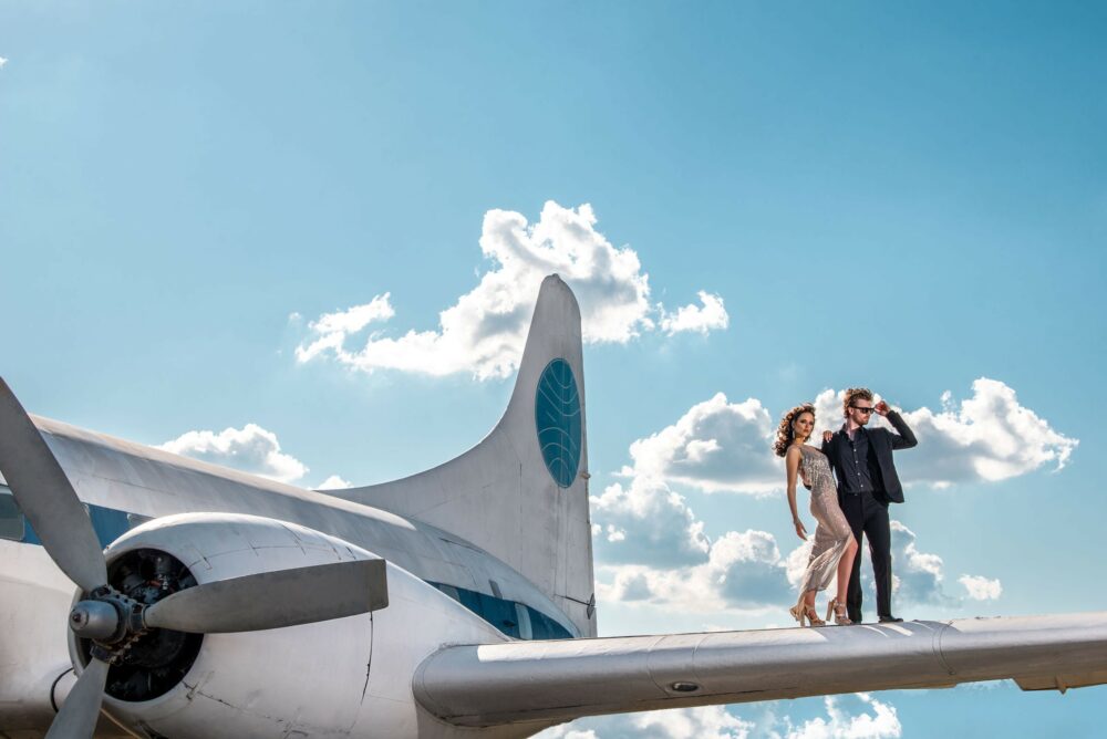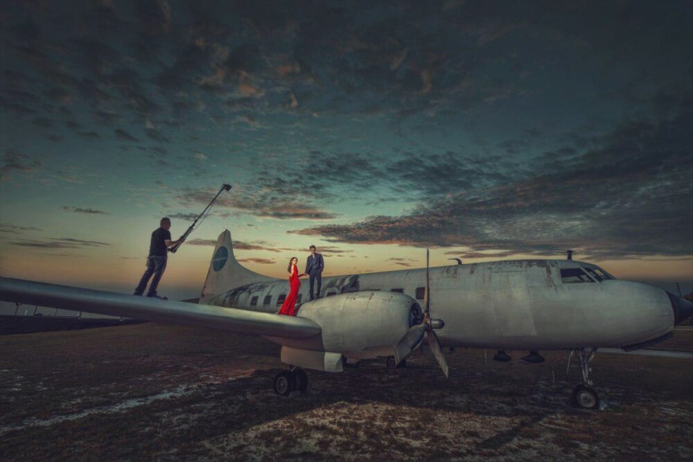 Since we had 1.5 hrs before sunset I decided to do some cool images on the plane with a direct sun behind the couple to create a feeling of being in the sky during a bright sunny day.