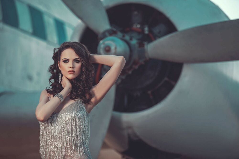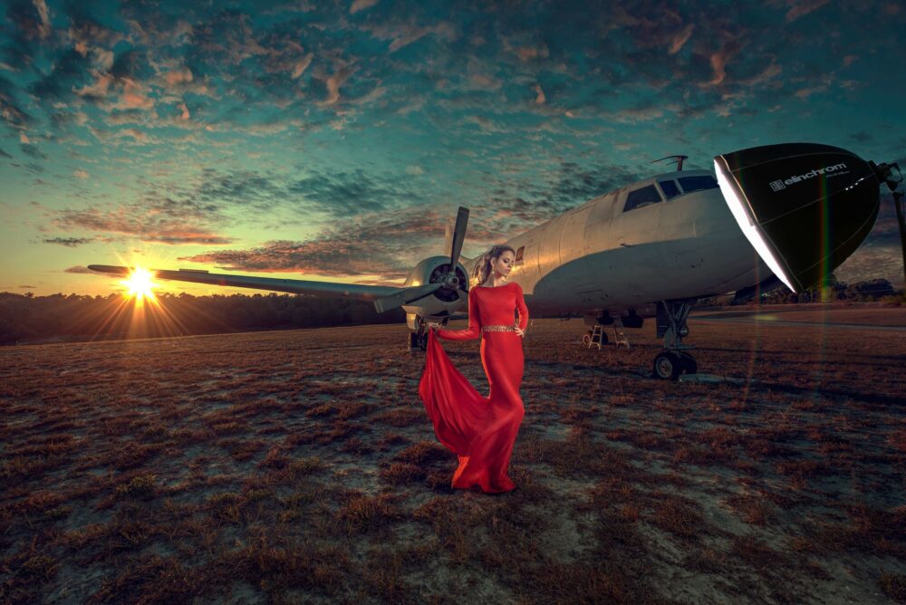 My model changed to another dress and we continued shooting on the ground but from another side of the airplane to see the beautiful orange sky and sun reflecting on the plane. I continued using the ELB 400 with one Quadra HS head and a Rotalux Softbox Deep Octa 100cm.