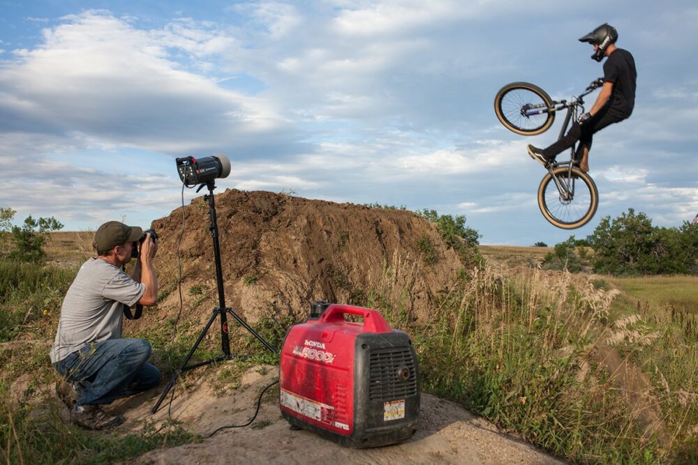 Next up was adding a second ELC Pro HD 1000. Adding the second light allowed us to light more of the biker’s moment during the jump. I wanted to have even lighting throughout the sequence. We placed this light about two meters from the first light, and connected it to the generator. Many colleagues have asked if the generator could supply constant power with two lights shooting at 10 frames per second. The 2000 watt Honda generator worked flawlessly powering the lights, and we didn’t miss a frame. We varied our shooting rate from 7-10 frames a second. Shooting slower frame rates gives you more separation between frames, which looks better when you are seaming up all the frames into one sequence shot. Doing these big jumps takes a lot work, so after about 45 minutes of shooting we were ready to call it a wrap.
