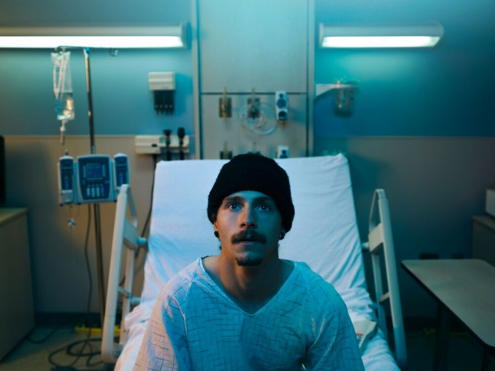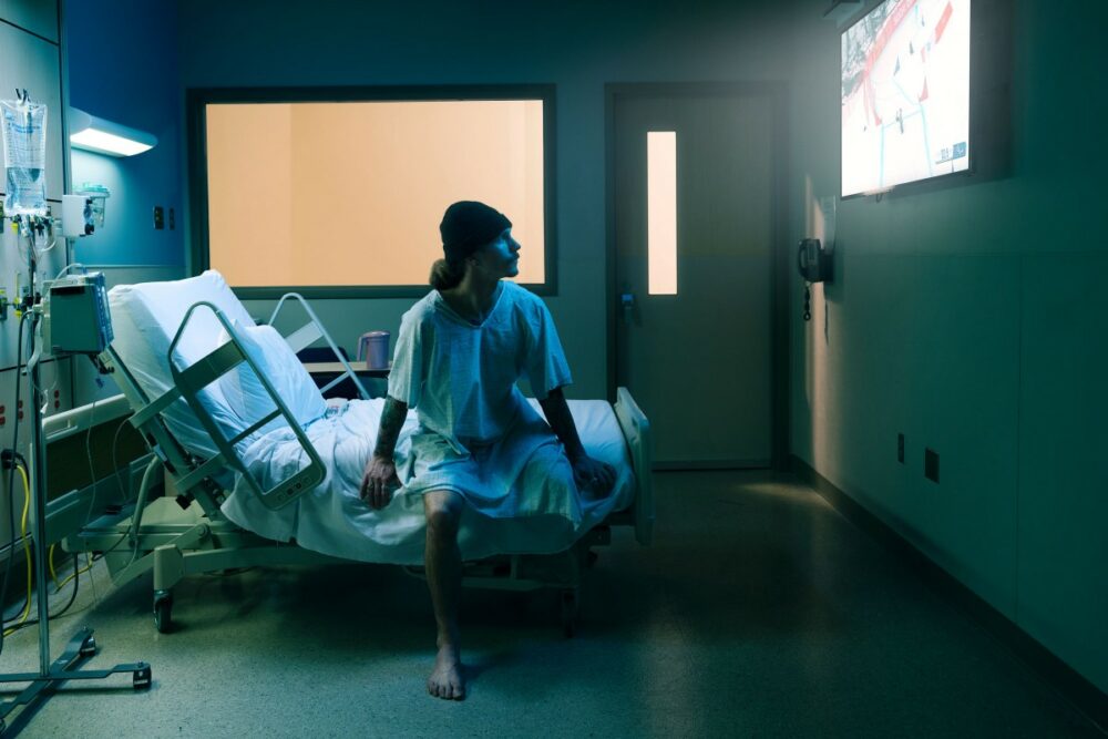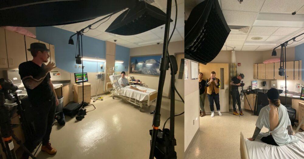 We rented a simulation hospital room and were able to create a really moody vibe using gels to make it feel like a TV was lighting him. Grids are super helpful for shots like this so you can control the spill of light and only cast it where it needs to go. On the close up we had one large gridded box acting as a “TV” with a blue gel, and a small gridded box providing fill for the background with a cyan gel. We also added a lRotalux Octabox 135cm (53″) to the scene with an amber gel to give it a pop of color.