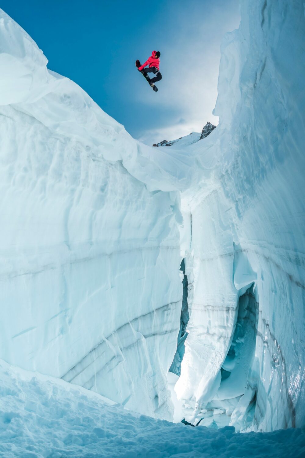 The star of the shot is the crevasse itself. It had to be wide, but not too wide or the skiers wouldn’t make it across. It also had to be deep enough to be impressive, but not so deep that the skiers would look too small in the photo.