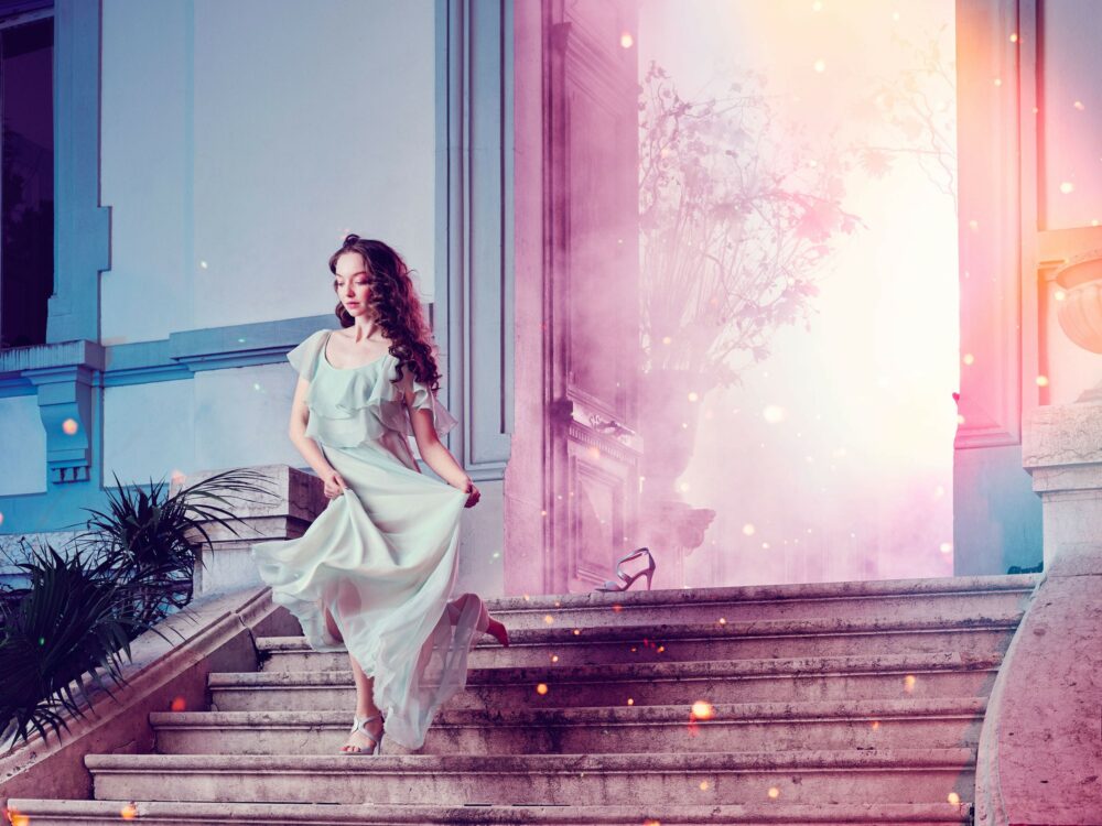 The idea was to shoot Cinderella with light in the style of Annie Lebovitz. The important point was that there needed to be a sense that the image was shot at night, and that we had to freeze the model in motion. To achieve this, we needed short flash durations withcombined super fast recycle time so that I could capture as many shots as possible during her walk down.