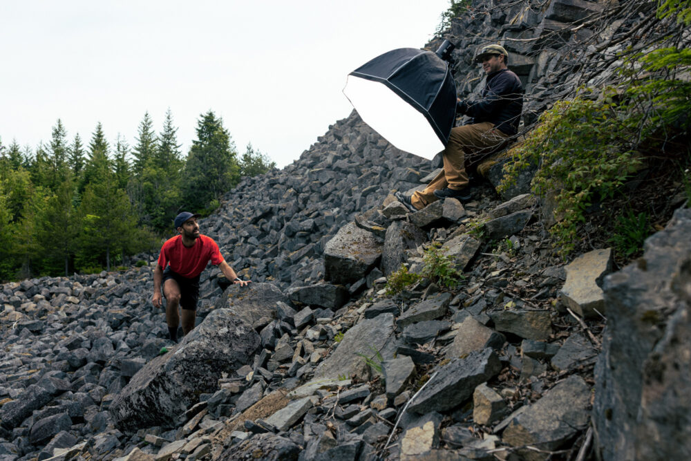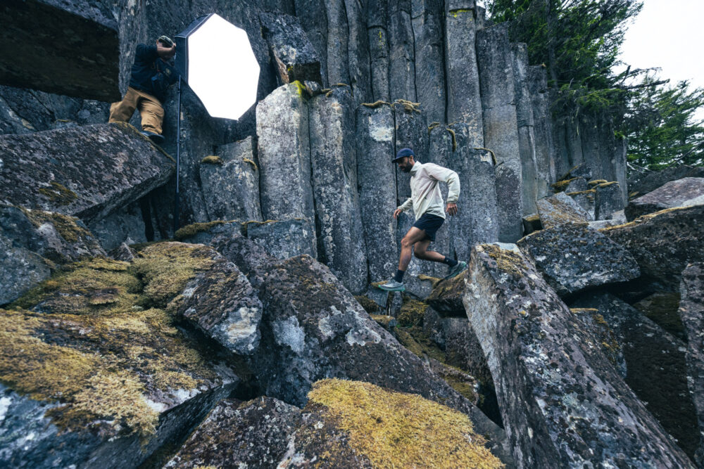 Compact, lightweight, and battery powered, the THREE was the perfect companion for this remote shoot. It gave us just the right amount of directional light to make the runner stand out against the stone, while allowing me to use modifiers to maintain the natural moody atmosphere of the scene. The portability meant we could move efficiently through the rocks, which was key considering the set was a field of unstable basalt blocks.