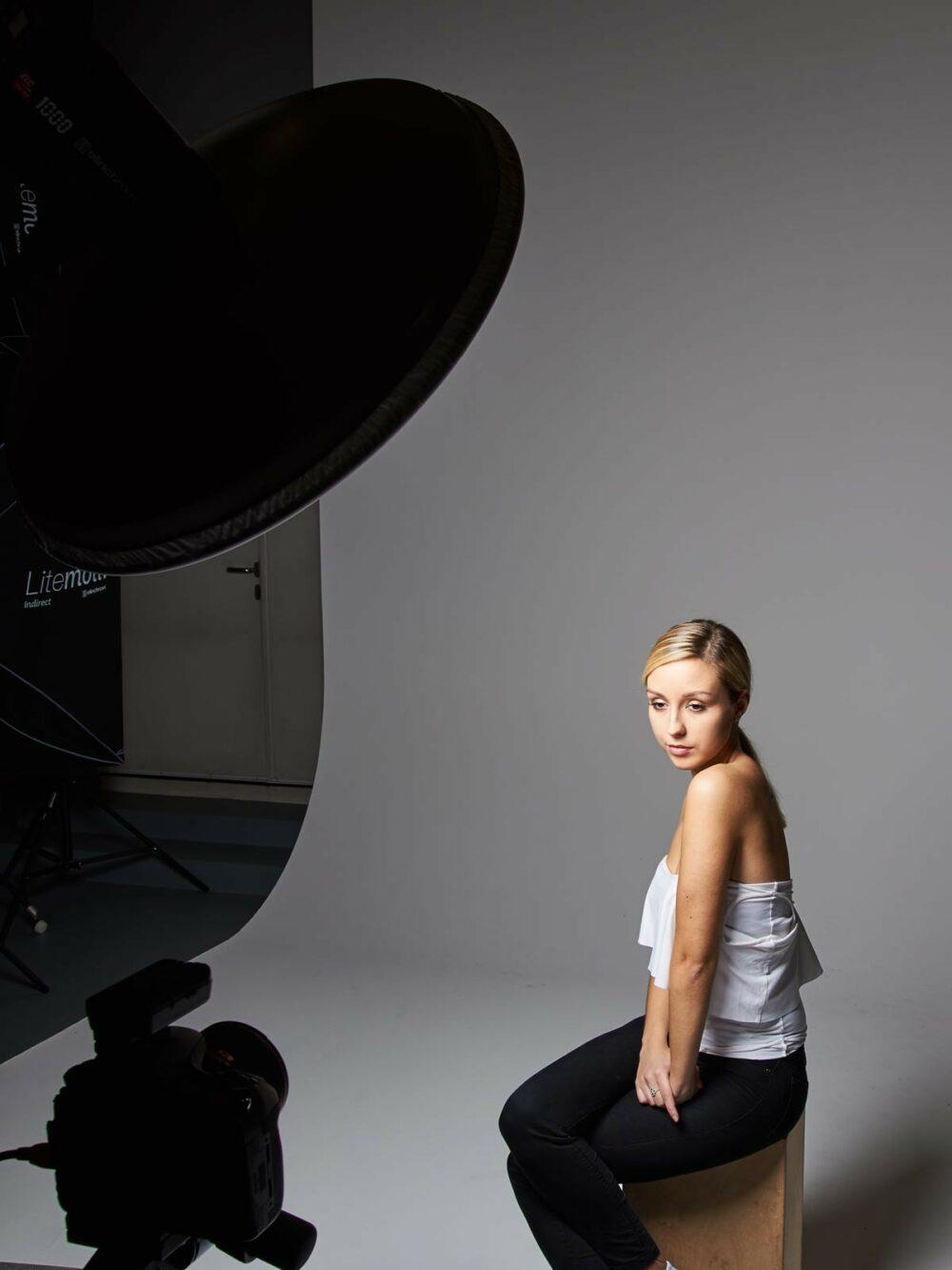 Our main light source is a simple 70 cm beauty dish, in front of our model. I used the silver one, with the diffusion sock, and the white deflector.