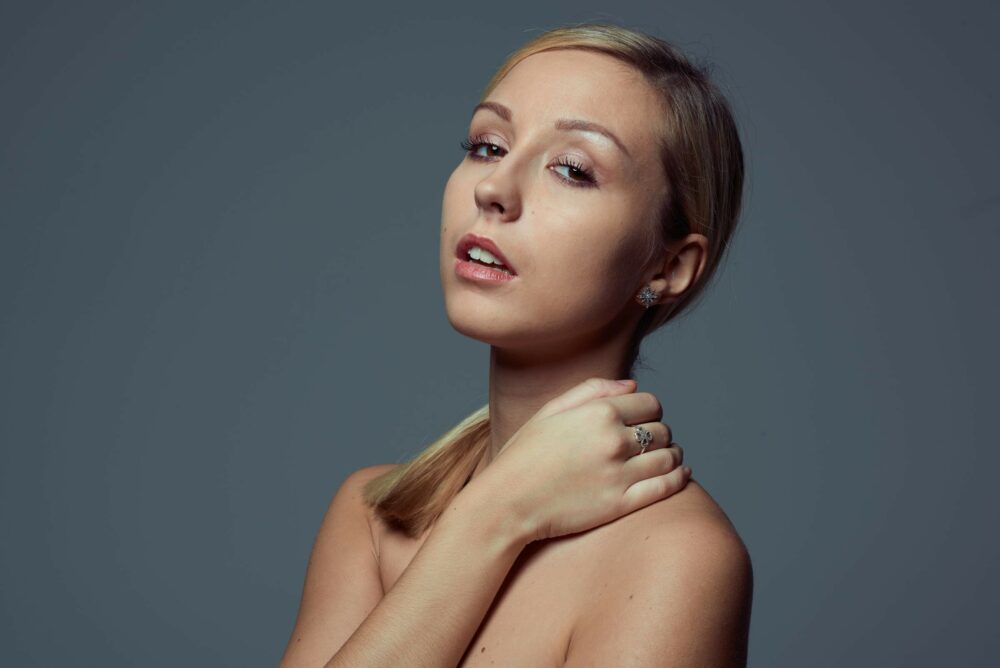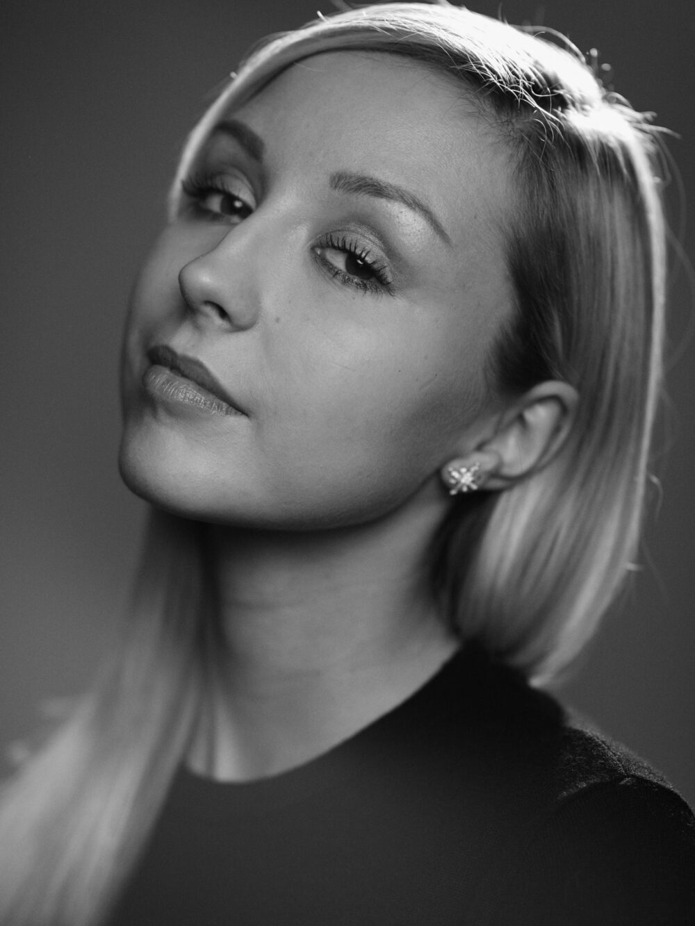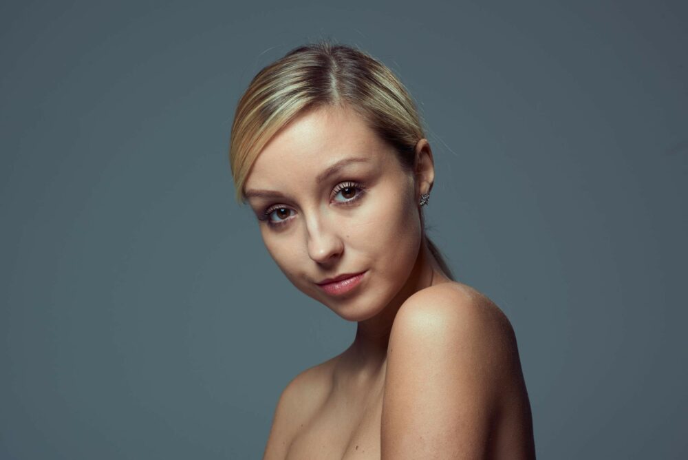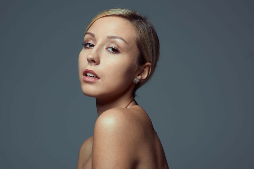 Still, the hair light is making things better, but the background is just flat and doesn’t have any interest here. So I decided to add a unit right behind my model with a 20° grid, lighting the background. It gives a beautiful glow to the seamless paper and gives more depth to the picture.