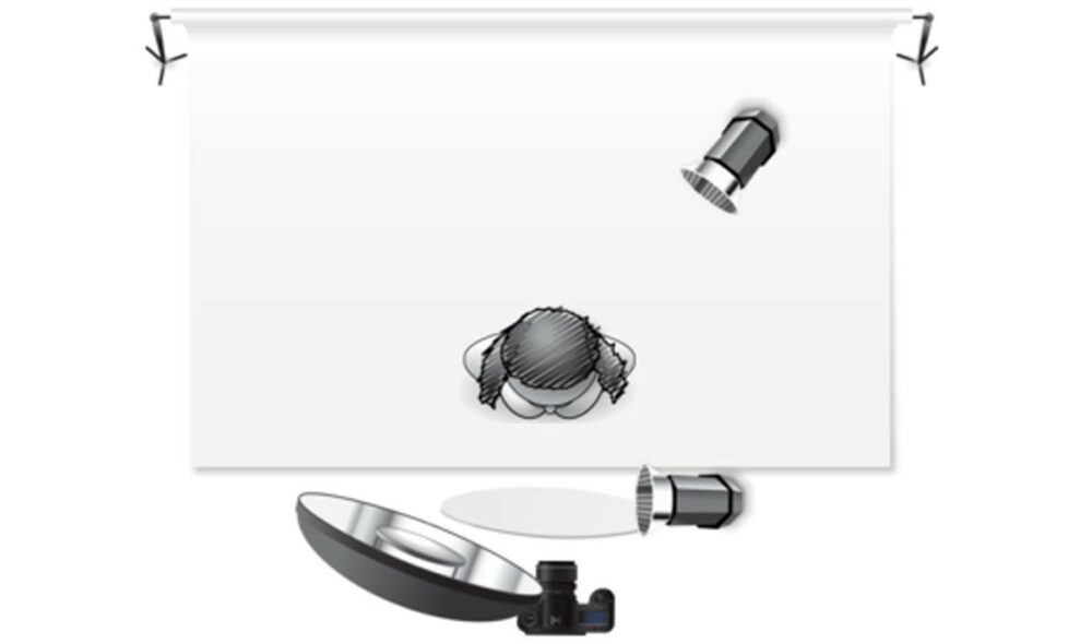 I could place a rectangular softbox, pointing upwards, at waist level instead, but the light would spill all over the place. Instead, let’s set a strobe with a 12° grid in front of the model, pointing down to a circular reflector that reflects the flash light into my model’s face.