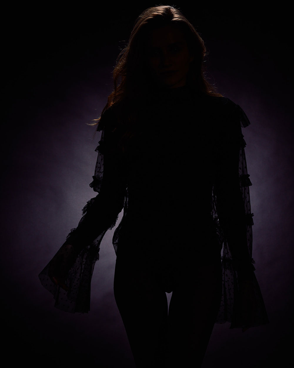 Working with such a focused light source demands clear communication with the subject. Maintaining a consistent position is crucial throughout the photoshoot to prevent unwanted shadows on the face. To add depth and separate Sophia from the background, I introduced a light with a 21cm (8”) grid reflector, with a 20-degree grid and adorned with barn doors. This strategic setup isolated the light, creating a striking focal point in the center of the backdrop.